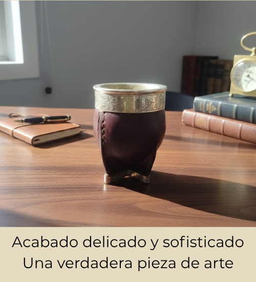 Una pieza de arte en tus manos. Calabaza premium seleccionada, forrada en cuero genuino con virola y base de alpaca. Un diseño imponente y sofisticado para quienes valoran la verdadera tradición artesanal.