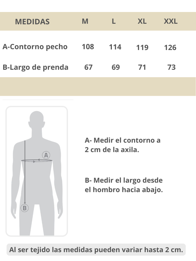 Tejido: Elaborado en punto ocho y canelón en frente y mangas, logrando una textura robusta y tradicional.